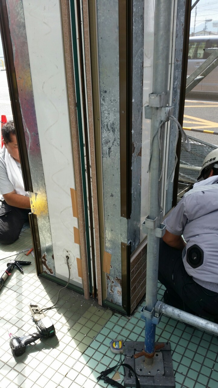まず見切りと出隅を両面テープ、シリコン、ステンレスビスで取り付けていきます。