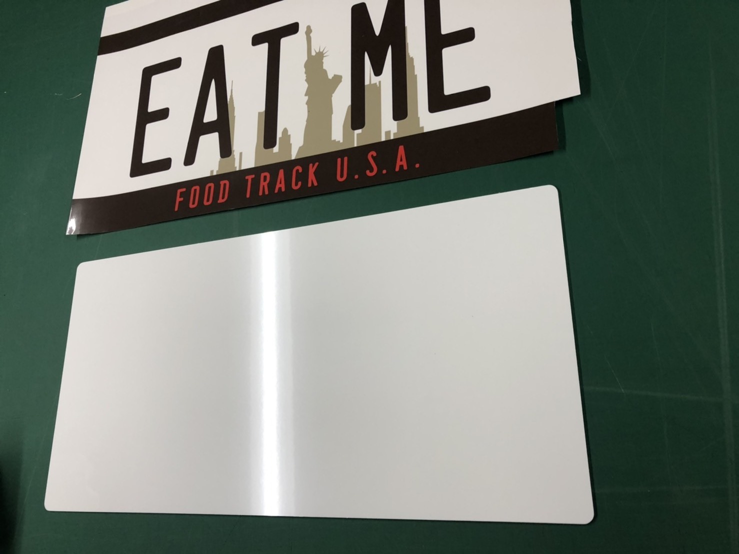 まずアルミ複合板を角Rにカットし、インクジェットシートにラミネートしたものを貼り