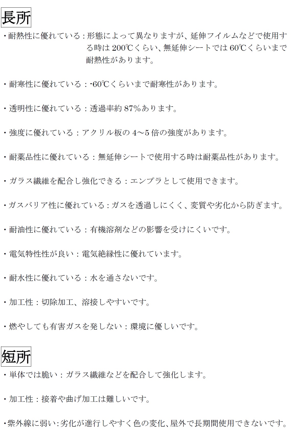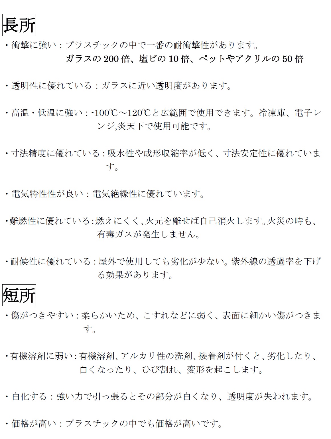 用途を見ても、透明性、耐衝撃性に優れているのが分かりますね。