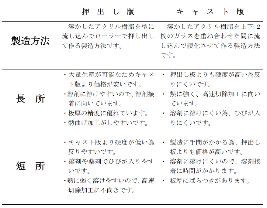 アクリル板は、製造方法によって『押出し板』と『キャスト板』の2種類があります。