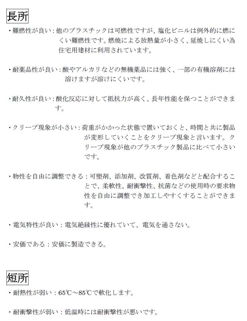 このように、塩ビには特性がたくさんあり建築資材、農業資材、工業資材、医療器材、日用品など幅広く利用されておりなくてはならない素材です。