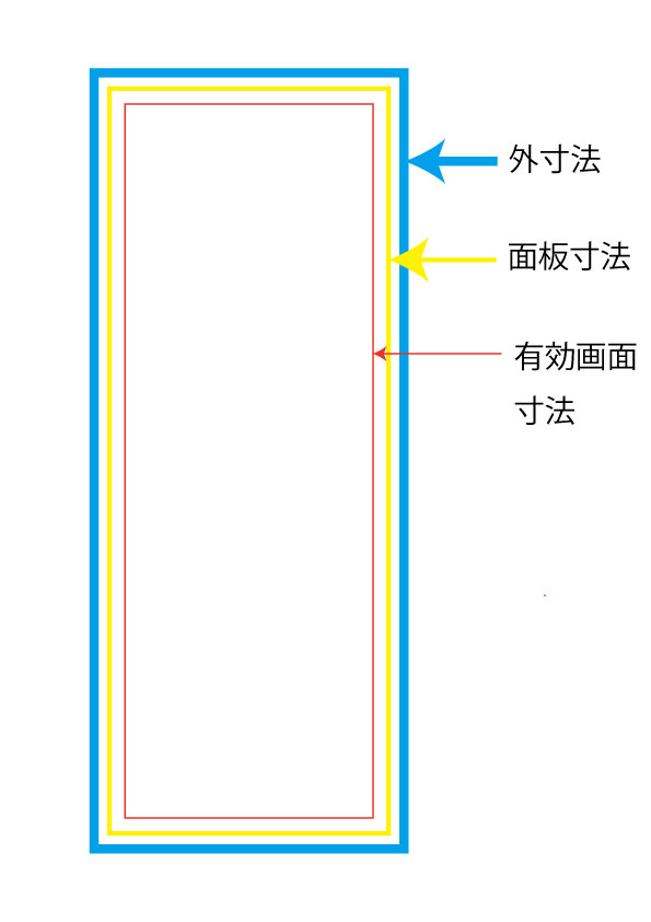 外寸法は、フレーム枠外側の寸法で、有効画面寸法は、フレーム枠内側の寸法となります。