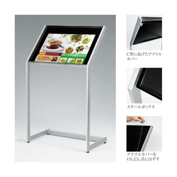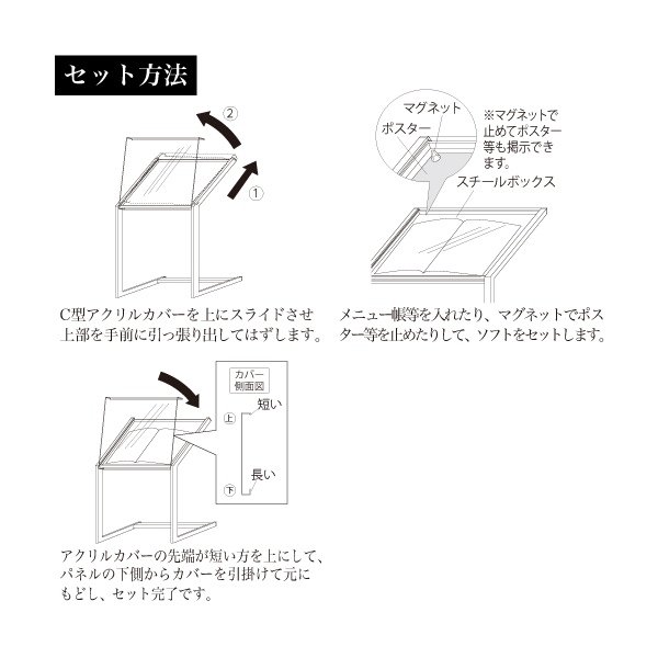 ●パネルはスチールボックスになっています。メニュー帳をそのまま入れたり、ポスター(A2サイズまで)をマグネットで止めても使用できます。